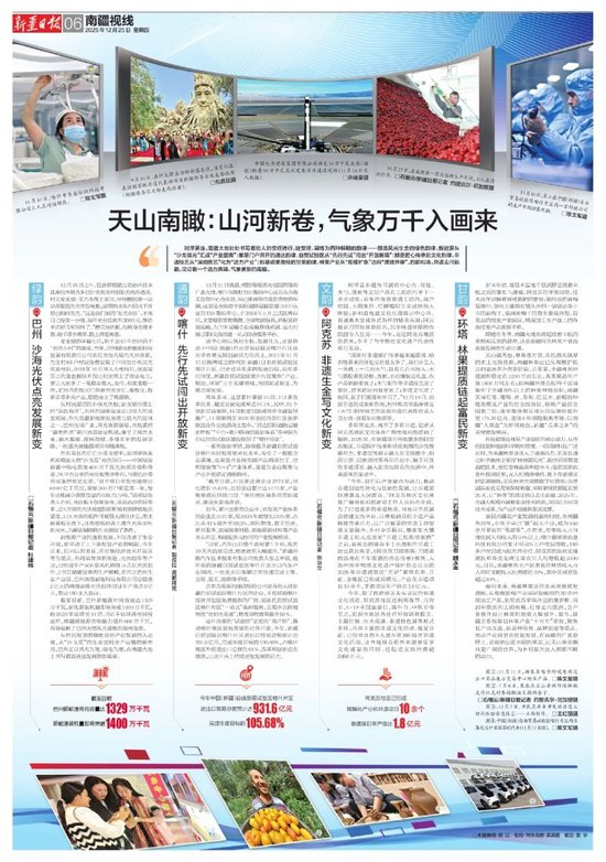 时序更迭,南疆大地处处书写着动人的变迁诗行。这变迁,凝练为四种鲜明的韵律——那是风光生金的绿色韵律,新能源从“沙戈微光”汇成“产业蓝海”;那是门户洞开的通达韵律,自贸试验区从“先行先试”闯出“开放新局”;那是匠心传承的文化韵律,非遗技艺从“深闺雅艺”化为“活力产业”;那是硕果盈枝的甘美韵律,林果产业从“规模扩张”迈向“质效并举”。四韵和鸣,共谱山河新篇,见证着一个活力奔涌、气象更新的南疆。