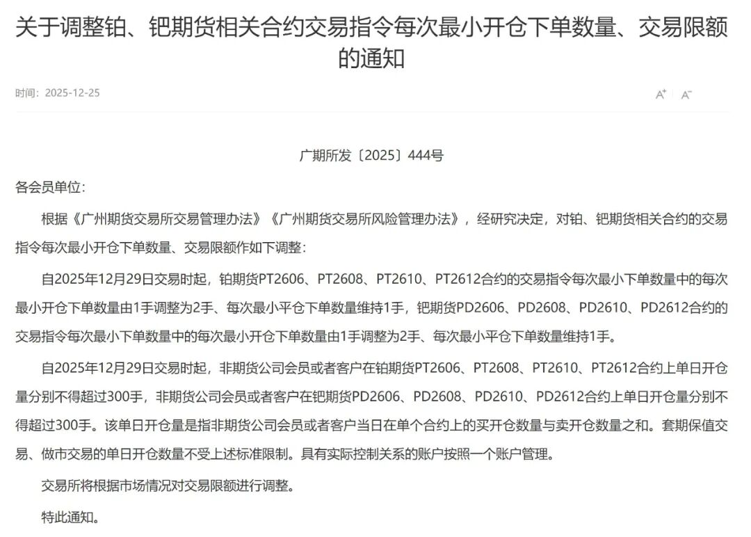 25日晚间,广期所调整铂、钯期货相关合约交易指令每次最小开仓下单数量、交易限额。