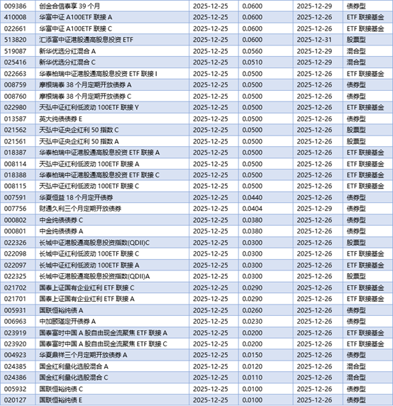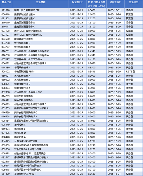 (1)12月25日新发基金共有5只,主要为混合型基金和债券型基金,其中平安添享6个月持有期债券A募集目标金额达30.00亿元;基金分红77只,多为债券型,派发红利最多的基金是上证5年期国债交易型开放式指数证券投资基金,每10份基金份额派发红利6.5420元;