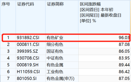 有挂钩ETF产品的有色主题指数,一共有6只,今年跑赢申万一级行业的仅3只,第一名有色矿业指数涨幅达到96%,比同类指数多涨10个点左右。