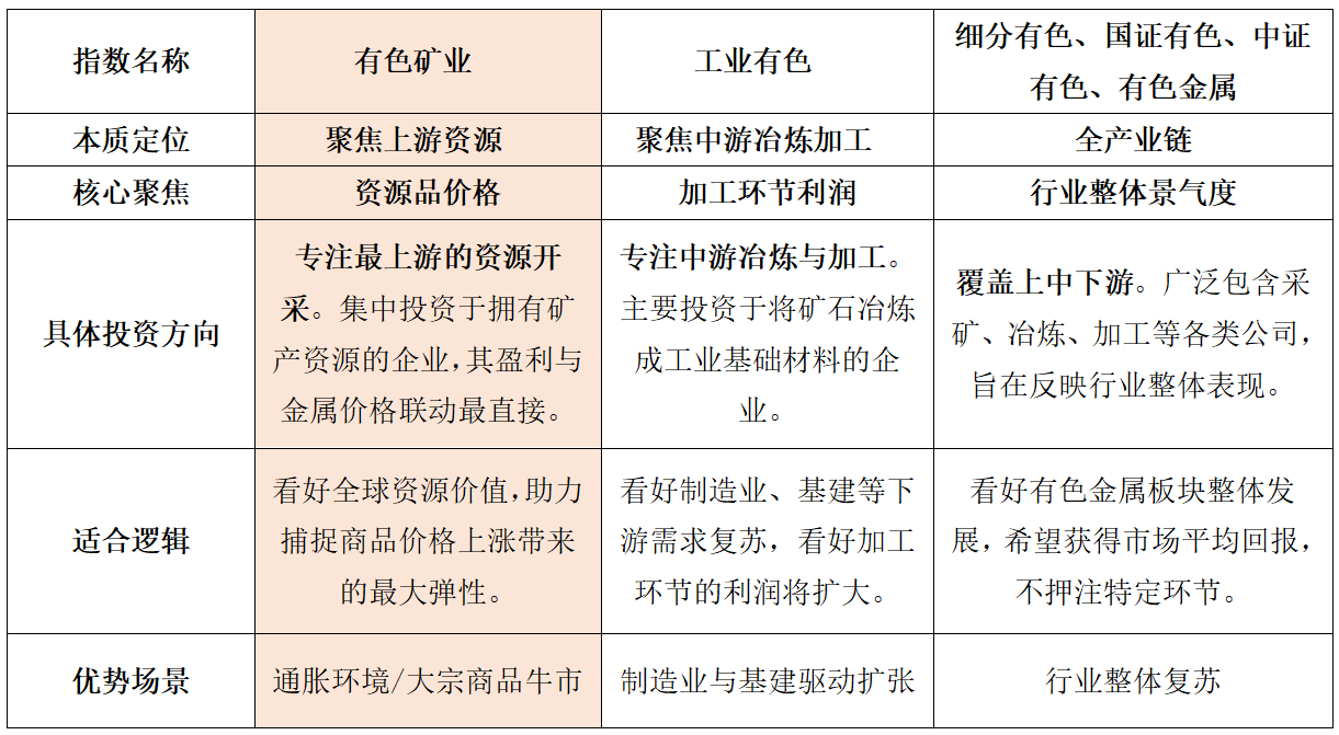 所以,有色矿业指数的逻辑非常清晰——看涨全球有色金属需求及价格。相比之下,其他指数逻辑相对更为复杂,需要同时判断上游资源价格和下游加工利润的变化。