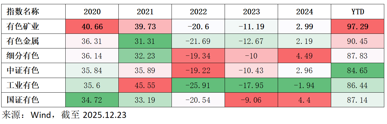 从各个年度来看,有色矿业指数在上涨行情中涨幅更大,如2020年、2021年、2025年相对更好;在下跌行情中,如2022年、2023年,有色矿业指数回撤均相对可控。