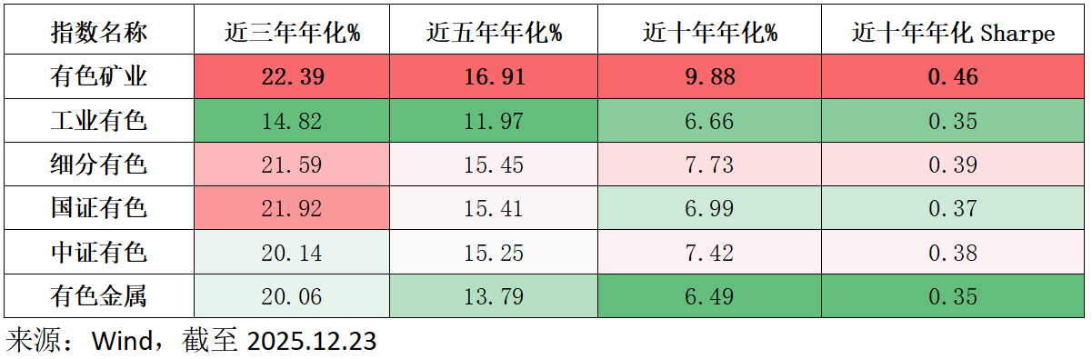 从不同区间来看,有色矿业指数在近三年、近五年、近十年等多个维度上,年化回报均优于其他5只指数。夏普比率也更高,意味着每承受一单位风险所获得的超额回报更高。