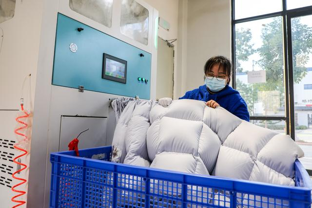 广西贵港市港南区桥圩镇一家羽绒制品生产企业的工作人员在检查羽绒被的充绒情况(12月18日摄)。新华社发