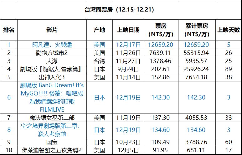 《阿凡达3》开画夺冠,首周观影人次174万,开画成绩为年度第3;