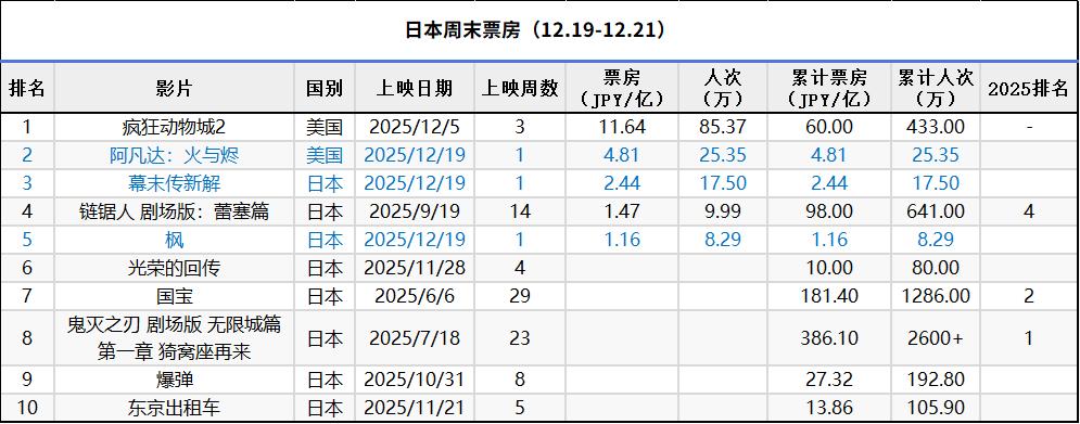 《疯狂动物城2》三连冠,累计票房超60亿日元,成为今年外片票房冠军;