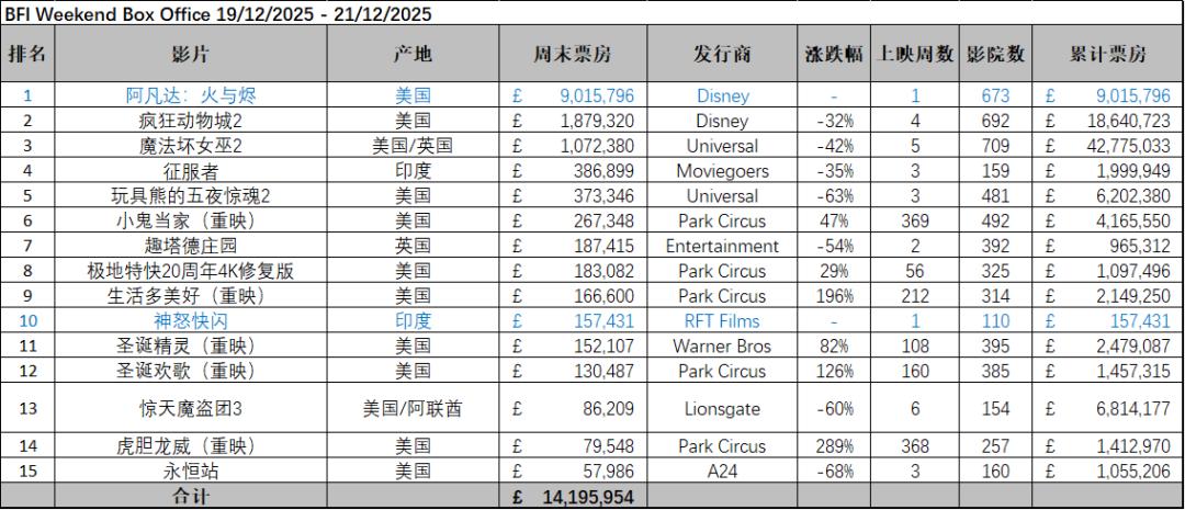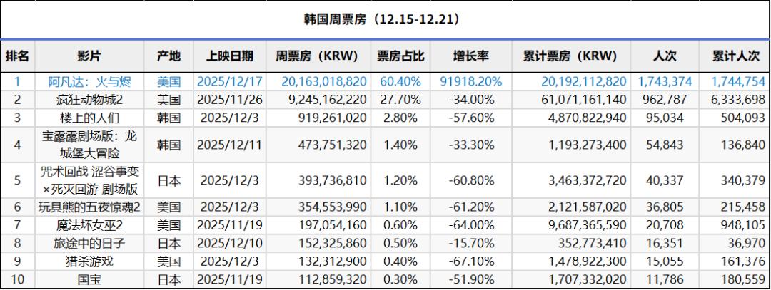 2025年第51周《阿凡达:火与烬》无悬念横扫全球,和上部比同期数据有所降低。