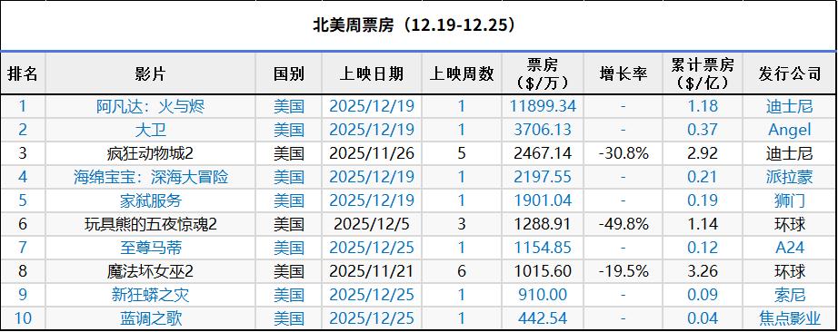 《阿凡达3》开画夺冠,首周票房1.26亿为年度第3高;