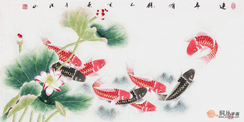 张洪四尺横幅荷花九鱼图《连年有余》作品来源:易从网