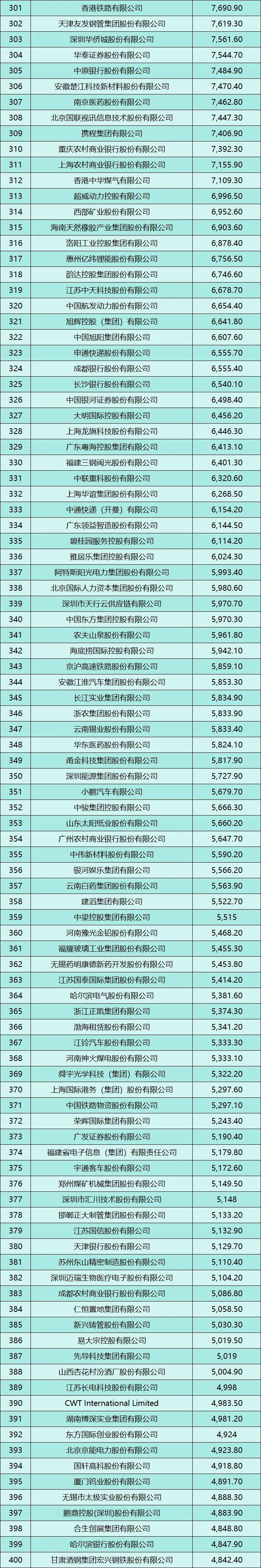 国家电网有限公司以5,484亿美元的营收位居榜首,中国石油和中国石化分列榜单第二位和第三位,位列第四位的是中国建筑集团,中国工商银行位列第五。苹果最大代工企业鸿海精密位列第六,较去年上升一位,仍是排名最高的台湾地区公司。中国农业银行、中国建设银行、中国银行分别位列第七、八、九名。中国铁路位列第十。