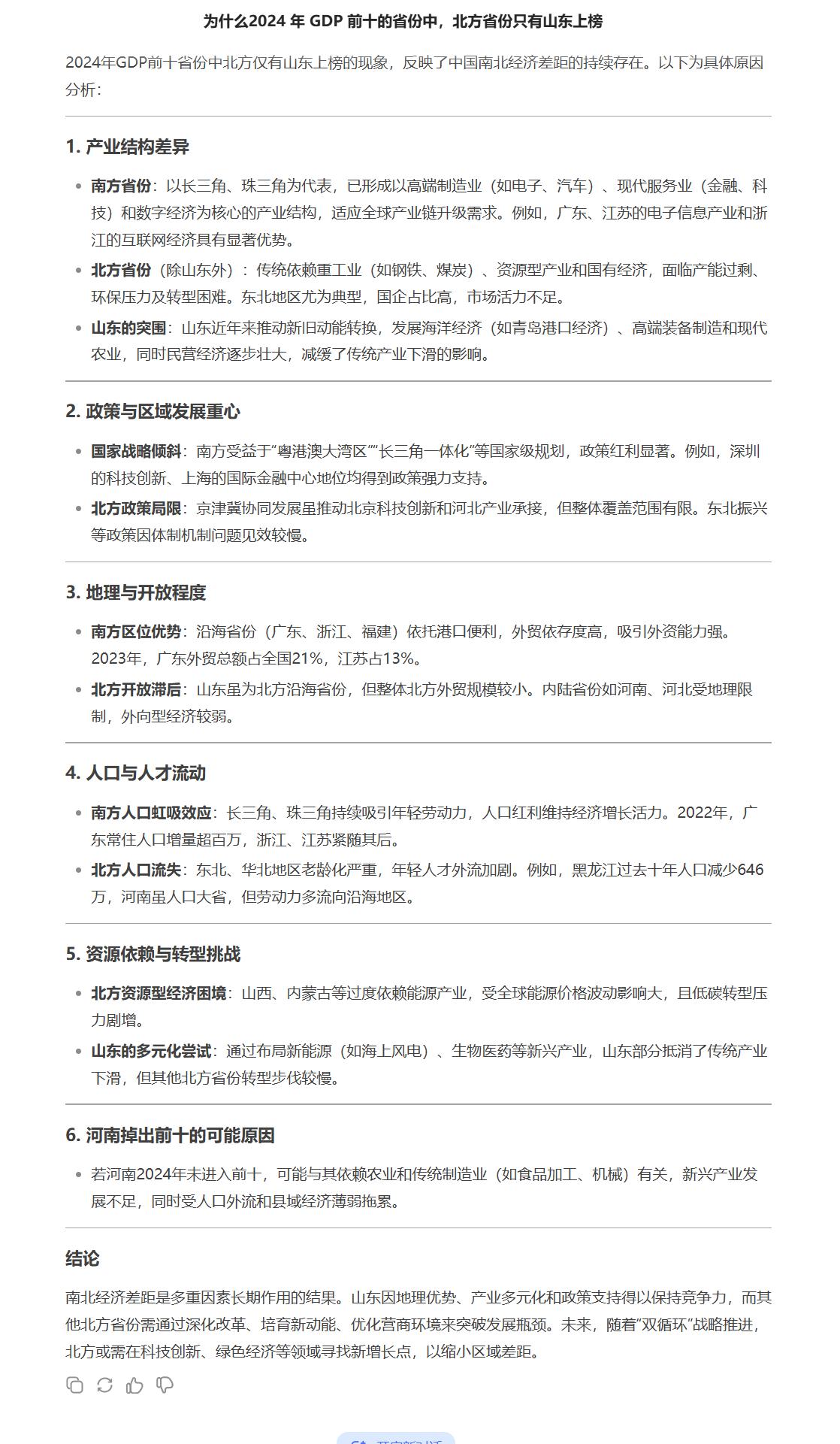 2024 年 GDP 前十的省份中,北方省份只有山东上榜。