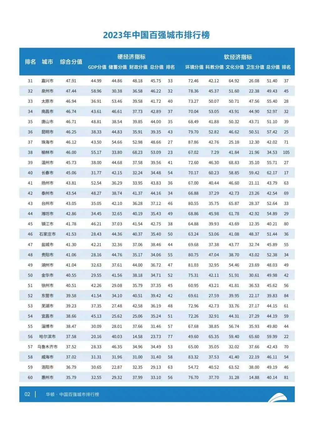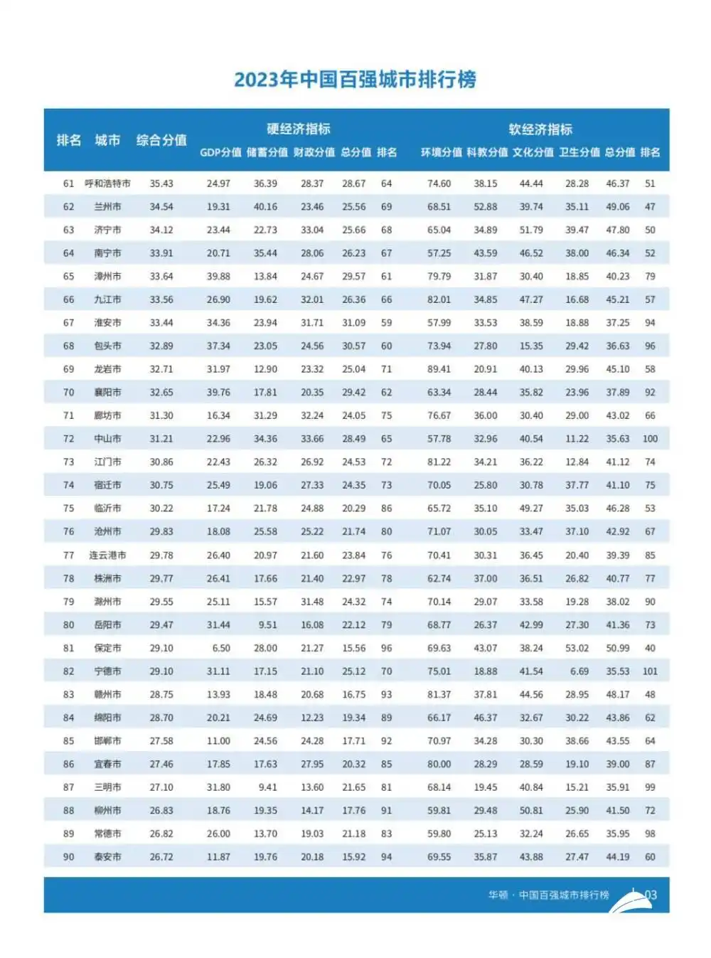 在硬经济方面,今年的百强城市共实现地区生产总值84.87万亿元(占国内生产总值70.16%),一般公共预算收入7.32万亿元(占地方一般公共预算收入67.30%),年末金融机构存款余额196.01万亿元(占全国金融机构存款余额74.13%),百强城市常住人口7.69亿人(占全国人口54.43%)。