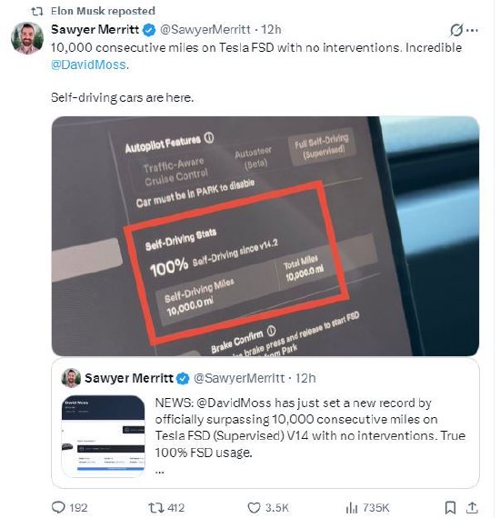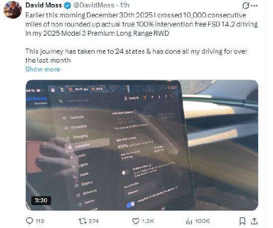 正文 美国一特斯拉车主创下连续“自动驾驶”1万英里的纪录 三木 V管理员 /2025-12-31 /0 评论 /10 阅读 1231 此篇文章发布距今已超过94天,您需要注意文章的内容或图片是否可用! 美国一位名叫David Moss的特斯拉车主在社交平台上发帖称,当地时间12月30日,他驾驶自己的一辆2025款Model 3,在100%无干预情况下使用FSD 14.2连续行驶超过了1万英里。 该车主表示,这次旅行跨越美国24个州,在过去的一个月里由FSD完成了所有的驾驶,包括所有的泊车和超充站停车。 电动汽车分析师索耶·梅瑞特在X上分享了这一消息,并附上了David Moss的行驶记录截图。特斯拉CEO马斯克转发了这条帖子。 美股频道更多独家策划、专家专栏,免费查阅>>