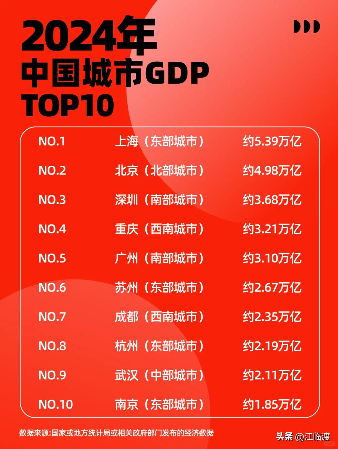 2024年国内GDP前十城市和2023年没有变化,仍然是上海(5.39万亿元)、北京(4.98万亿元)、深圳(3.68万亿元)、重庆(3.22万亿元)、广州(3.10万亿元)、苏州(2.67万亿元)、成都(2.35万亿元)、杭州(2.19万亿元)、武汉(2.11万亿元)、南京(1.85万亿)。