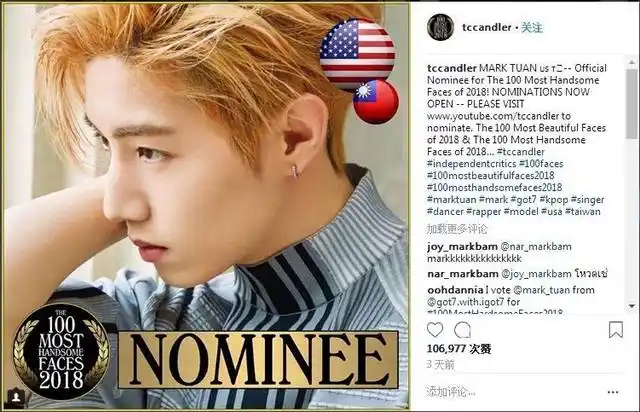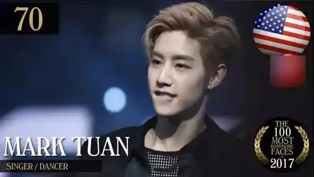 和嘉尔同属GOT7的Mark段宜恩在去年排名第70位,今年也是依旧入榜。