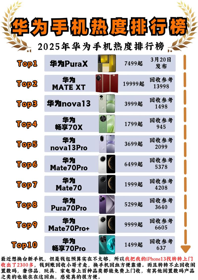 正文 华为口碑最好的十款手机2025年排行榜前十名榜单出炉 三木 V管理员 /01-05 /0 评论 /11 阅读 0105 文章最后更新时间2026年01月05日,若文章内容或图片失效,请留言反馈! 华为Mate 30 Pro是华为公司研发的智能手机,采用6.53英寸OLED显示屏,其核心配置上,Mate 30 Pro 5G采用2400×1176全面屏,前置3200万像素,后置4000万电影摄像头+4000万超感光摄像头+800万长焦+3D深感摄像头徕卡四摄,还搭载海思麒麟990八核处理器,预装基于Android 10的EMUI 10操作系统。该产品有丹霞橙、青山黛、罗兰紫、星河银、翡冷翠、亮黑色六种颜色选择。