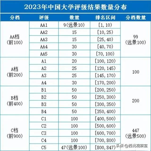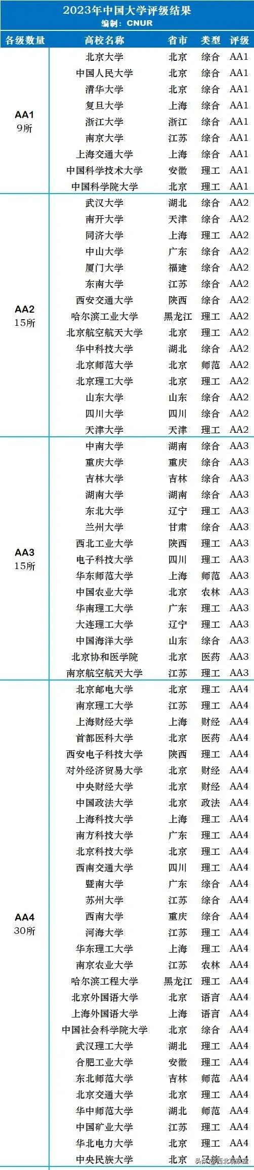 正文 权威发布!2023年度中国大学评级排行榜单出炉 三木 V管理员 /01-06 /0 评论 /10 阅读 0106 文章最后更新时间2026年01月06日,若文章内容或图片失效,请留言反馈! 2023年中国大学评级共有846所高校(公办)上榜,将顶尖水平高校到初具一定本科办学经验高校划分为四档十八级——AA档、A档、B档以及C档,其中AA档和C档细分五个级别,A档和B档细分四个级别,每个评级结果对应高校数量总体符合金字塔式分布,直观有效地体现了各层次高校办学实力。 这里只公布69所AA档高校名单。