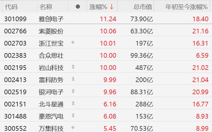 A股市场无人驾驶概念股集体走强,其中,雅创电子涨超11%,索菱股份、浙江世宝、合众思壮、岩山科技、雷科防务、银河电子10CM涨停,北斗星通、豪恩汽电涨超6%,万集科技涨超5%。