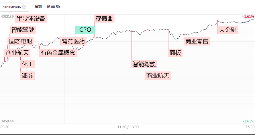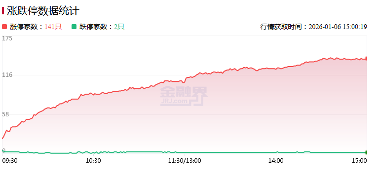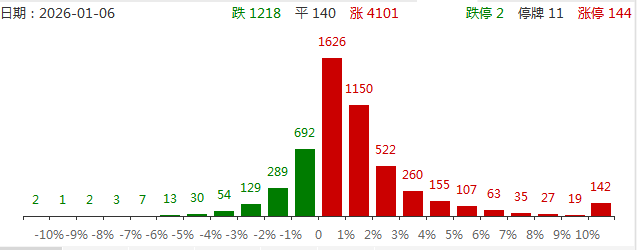 1月6日,三大指数集体收涨,沪指高开高走,再创十年新高。截至收盘,沪指涨1.5%,报4083.67点,创10年新高;深证成指涨1.4%,报14022.55点;创业板指涨0.75%,报3319.29点。量能持续放大,沪深两市成交额2.81万亿,较上一个交易日放量2602亿。盘面上,市场热点轮番活跃,全市场超4100只个股上涨,多达143只个股涨停,连续两日超百股涨停。