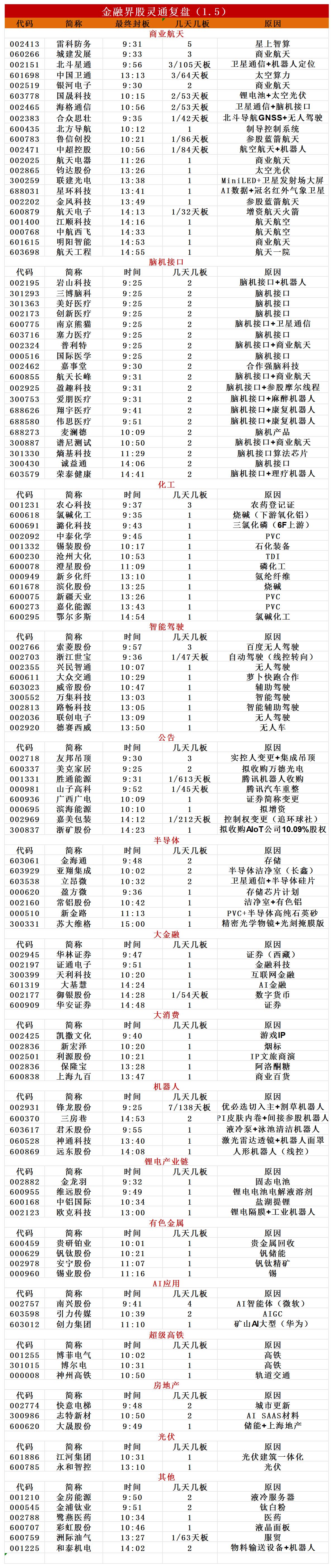 从板块来看,商业航天概念持续爆发,十余只成分股涨停,鲁信创投8天6板,北斗星通、中国卫通6天4板。脑机接口概念延续强势,三博脑科、美好医疗、创新医疗2连板。大金融板块集体拉升,华林证券、大智慧涨停。智能驾驶概念走强,万集科技、路畅科技等多股涨停。化工板块走高,中泰化学、潞化科技、氯碱化工涨停。有色金属板块表现活跃,洛阳钼业、紫金矿业等多股创历史新高。