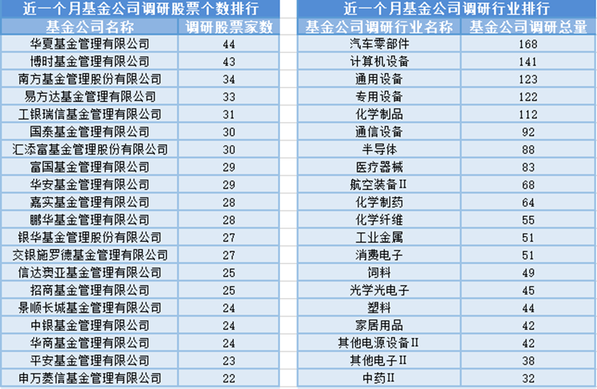 近一个月(12月10日-1月9日),华夏基金参与公司调研的数量最多,共调研44家上市公司,此外调研较为活跃的还有博时基金、南方基金和易方达基金,分别调研43家、34家、33家上市公司;从调研行业上来看,基金公司对汽车零部件行业的上市公司调研次数最多,共有168次,其次是计算机设备行业,基金公司调研了141次。