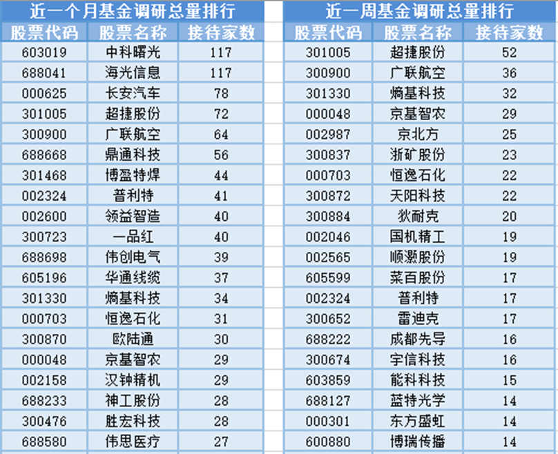 从个股调研情况上来看,最近1个月(12月10日-1月9日)最受公募基金关注的是中科曙光,中科曙光属于专用计算机设备行业,主营业务为高端计算机、存储、安全、数据中心产品的研发及制造,同时大力发展数字基础设施建设、智能计算等业务。共有117家基金管理公司参与调研,其次是海光信息和长安汽车,分别接受117家、78家基金管理公司的调研。