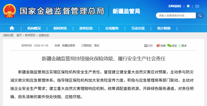 正文 新疆金融监管局:持续强化保险效能,履行安全生产社会责任 三木 V管理员 /01-09 /0 评论 /8 阅读 0109 文章最后更新时间2026年01月09日,若文章内容或图片失效,请留言反馈! 据新疆金融监管局网站,新疆金融监管局发文称要压实辖区保险机构安全生产责任,督促建立健全重大自然灾害应对预案,主动参与防灾减灾救灾和应急管理体系。指导辖区保险机构加大安责险宣传力度,积极与应急管理局等部门联动,主动对接企业安全生产需求;建立重大自然灾害理赔响应机制,统筹调配查勘资源,开辟绿色服务通道,对责任明确、损失清晰的案件快处快赔、应赔尽赔。 关键词阅读: