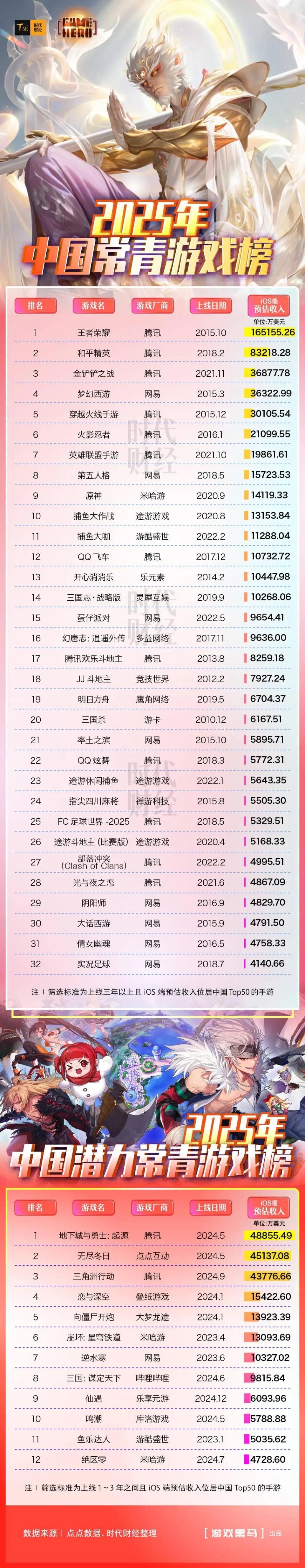 时代财经以上线3年以上且iOS端预估收入跻身中国地区Top50为筛选标准,统计并发布《 2025年中国常青游戏榜》(下称“《常青榜》”);同时以上线1年至3年且iOS端预估收入跻身中国地区Top50为标准,统计并发布《2025年中国潜力常青游戏榜》(下称“《潜力常青榜》”)。