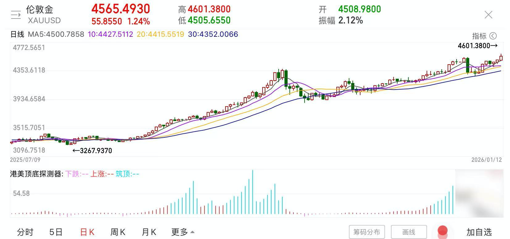 2026年1月12日早盘,现货黄金强势拉涨,盘中首次突破4600美元/盎司,新年首月黄金价格已累计上涨280美元。截至发稿,金价有小幅回落。今日现货白银同样大涨,盘中飙涨超5%,一度突破83美元。