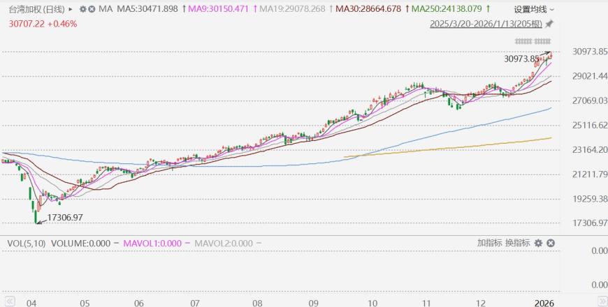 正文 台股收涨0.92%,再创历史新高 三木 V管理员 /01-13 /0 评论 /8 阅读 0113 文章最后更新时间2026年01月13日,若文章内容或图片失效,请留言反馈! 1月13日,台湾加权指数盘中一度涨1.33%报30973.85点,再创历史新高;最终收涨0.46%报30707.22点,再创收盘历史新高。 消息面上,美对台关税据报由20%调降至15%,条件是台积电需在亚利桑那州增设五个工厂。如果属实,这一税率将与日韩与美国商定的相同。日韩去年与美国就关税达成协议。 股票频道更多独家策划、专家专栏,免费查阅>>