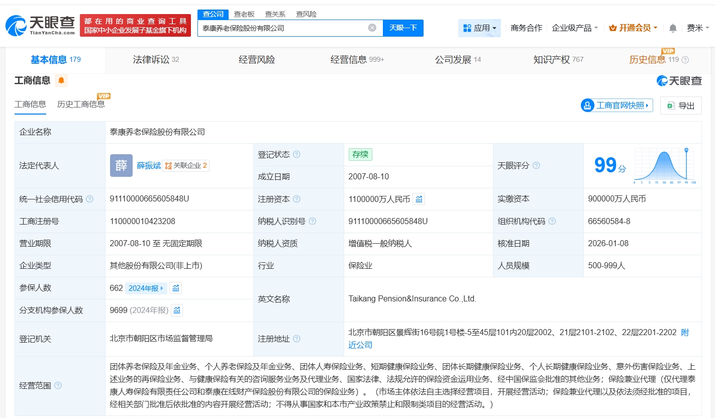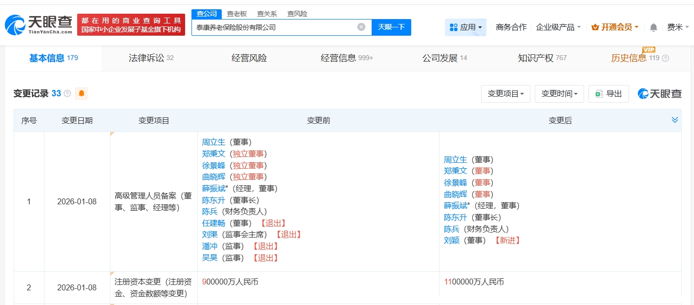 正文 泰康养老保险公司增资至110亿 增幅约22% 三木 V管理员 /01-13 /0 评论 /10 阅读 0113 文章最后更新时间2026年01月13日,若文章内容或图片失效,请留言反馈! 天眼查工商信息显示,近日,泰康养老保险股份有限公司发生工商变更,注册资本由90亿人民币增至110亿,增幅约22%,同时多位主要人员发生变更。 泰康养老保险股份有限公司成立于2007年8月,法定代表人为薛振斌,经营范围包括团体养老保险及年金业务、个人养老保险及年金业务、团体人寿保险业务、短期健康保险业务等。股东信息显示,该公司由泰康保险集团股份有限公司、泰康资产管理有限责任公司共同持股。 关键词阅读: