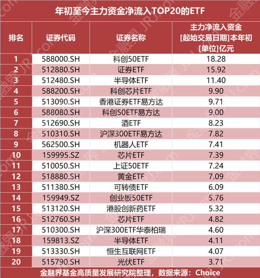 在这项引导长期资本流向的顶层设计落地之际,二级市场主力资金的布局方向也备受关注。据Choice数据显示,年初至今,市场“聪明钱”的偏好与政策引导方向已呈现部分重合。年内最受主力资金青睐的ETF包括华夏科创50ETF、国泰证券ETF和国联安半导体ETF,三只产品均获超10亿元净买入;另有12只ETF的净流入规模超5亿元。
