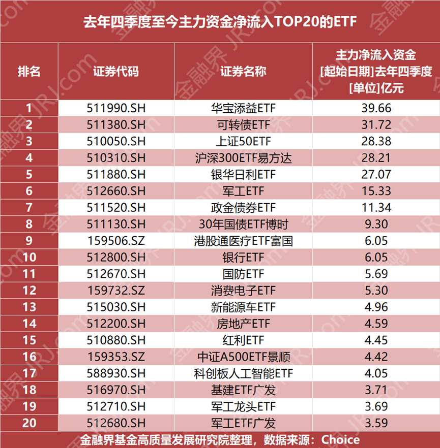 若再将观察周期拉长至去年四季度,主力资金的配置思路则更为多元。彼时,货币、债券类稳健型ETF仍是吸金主力,与此同时,部分军工、国防及基建类ETF也持续获得资金青睐,这既体现出资金对增长的追求,也反映出其对军工、基建等具备战略意义领域的持续关注。