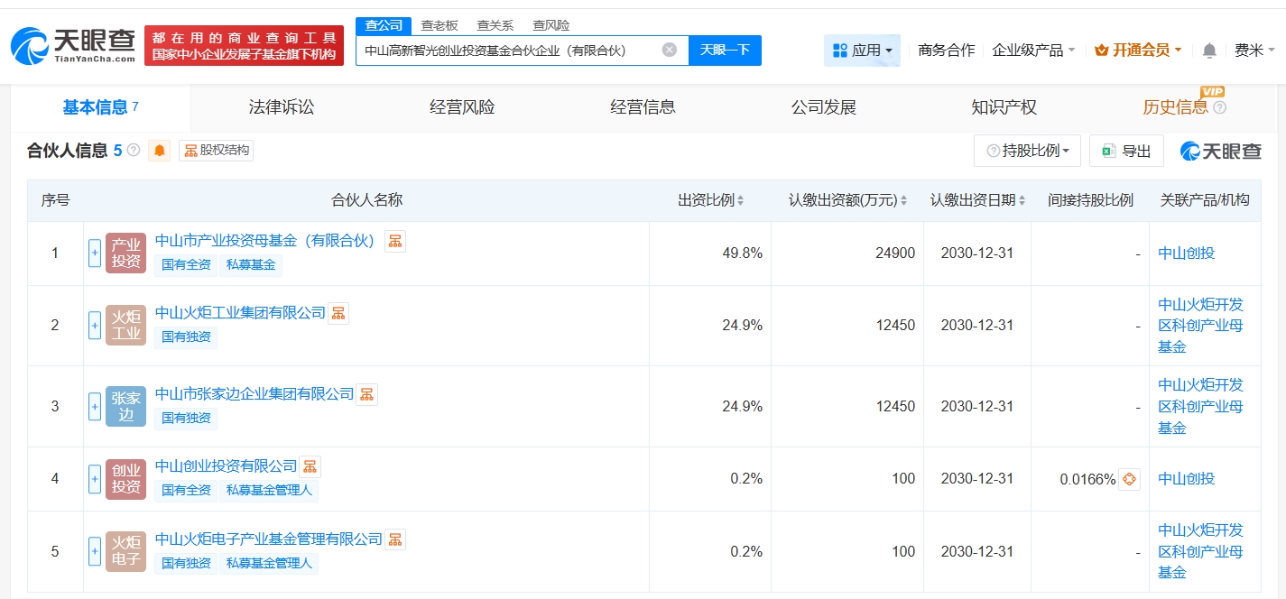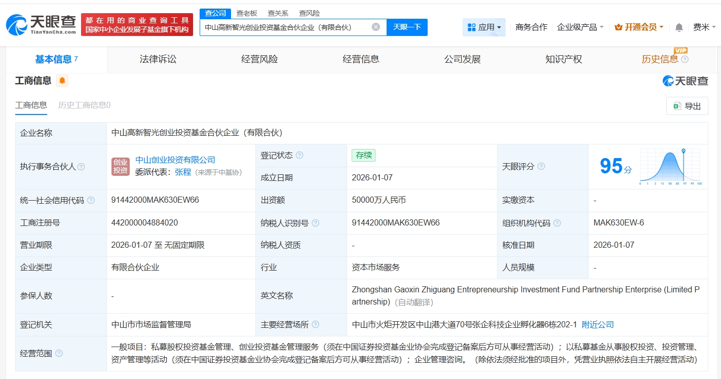 正文 中山高新智光创业投资基金登记成立 出资额5亿 三木 V管理员 /01-14 /0 评论 /10 阅读 0114 文章最后更新时间2026年01月14日,若文章内容或图片失效,请留言反馈! 天眼查工商信息显示,近日,中山高新智光创业投资基金合伙企业(有限合伙)成立,执行事务合伙人为中山创业投资有限公司,出资额5亿人民币,经营范围为私募股权投资基金管理、创业投资基金管理服务,以私募基金从事股权投资、投资管理、资产管理等活动,企业管理咨询。合伙人信息显示,该基金由中山市产业投资母基金(有限合伙)、中山火炬工业集团有限公司、中山市张家边企业集团有限公司等共同出资。 关键词阅读: