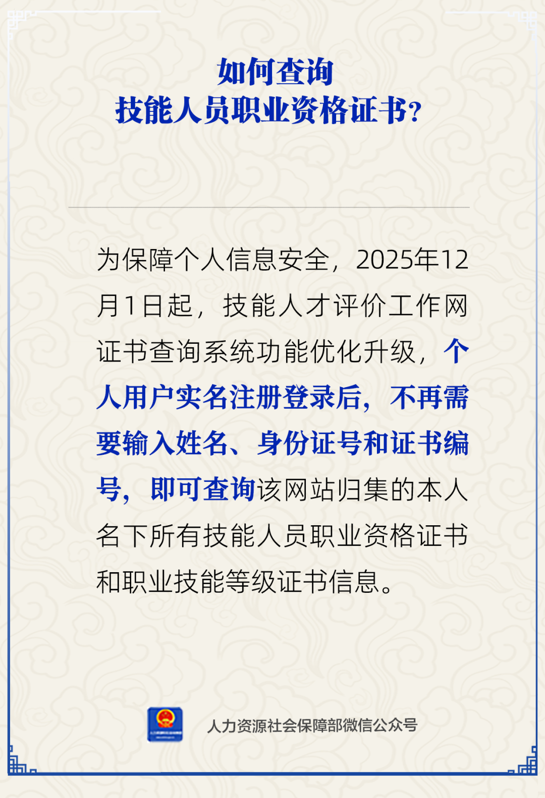 正文 如何查询技能人员职业资格证书?人社部解答 三木 V管理员 /01-15 /0 评论 /9 阅读 0115 文章最后更新时间2026年01月15日,若文章内容或图片失效,请留言反馈! 中新网1月14日电 如何查询技能人员职业资格证书?人社部1月14日通过官方微信公众号作出解答。 为保障个人信息安全,2025年12月1日起,技能人才评价工作网证书查询系统功能优化升级,个人用户实名注册登录后,不再需要输入姓名、身份证号和证书编号,即可查询该网站归集的本人名下所有技能人员职业资格证书和职业技能等级证书信息。