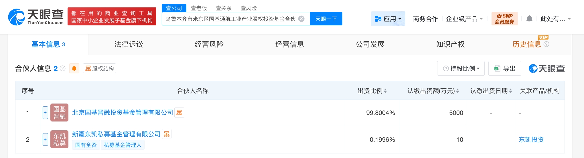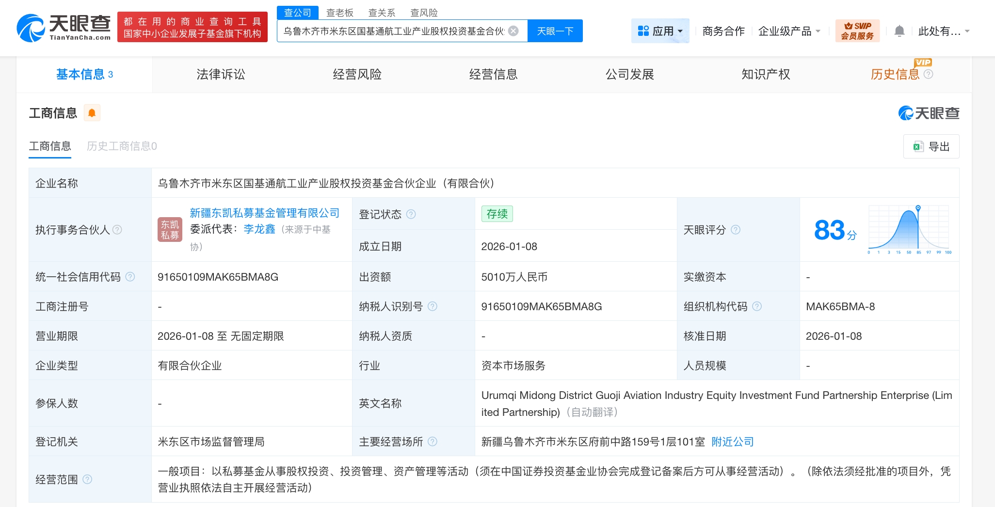 正文 乌鲁木齐市米东区国基通航工业产业基金成立 出资额5010万 三木 V管理员 /01-15 /0 评论 /11 阅读 0115 文章最后更新时间2026年01月15日,若文章内容或图片失效,请留言反馈! 天眼查工商信息显示,近日,乌鲁木齐市米东区国基通航工业产业股权投资基金合伙企业(有限合伙)成立,执行事务合伙人为新疆东凯私募基金管理有限公司,出资额5010万人民币,经营范围为以私募基金从事股权投资、投资管理、资产管理等活动。合伙人信息显示,该基金由北京国基晋融投资基金管理有限公司、新疆东凯私募基金管理有限公司共同出资。 关键词阅读: