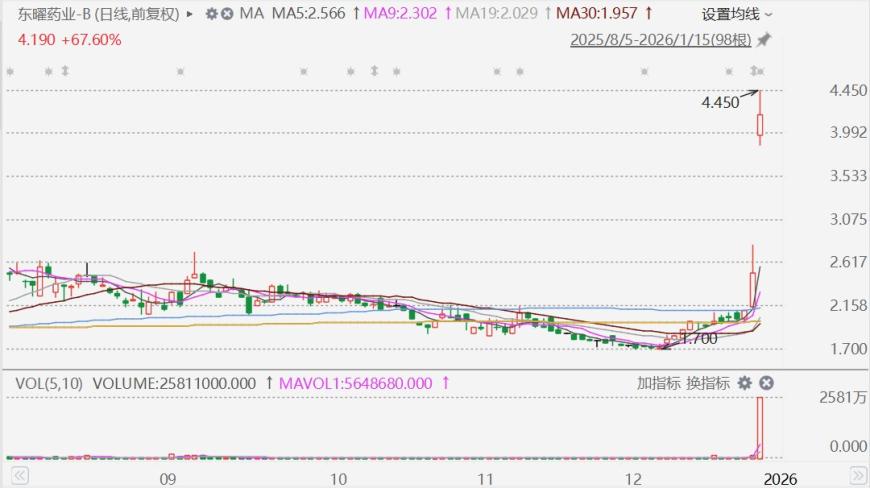 正文 东曜药业复牌放量飙升78%,获药明合联提要约收购 三木 V管理员 /01-15 /0 评论 /8 阅读 0115 文章最后更新时间2026年01月15日,若文章内容或图片失效,请留言反馈! 1月15日,东曜药业(1875.HK)获药明合联(2268.HK)提出全面收购要约,今日复牌股价飙升,盘中一度涨78%至4.45港元,股价创2021年11月以来新高,截至目前成交额放大至1亿港元。 消息面上,药明合联及东曜药业宣布,药明合联向东曜药业提出全面收购要约,现金要约价每股4港元,较停牌前报价2.5港元溢价60%,要约的最高代价约27.9亿港元。药明合联拟以内部资源拨付,并拟维持东曜药业的上市地位。 股票频道更多独家策划、专家专栏,免费查阅>>