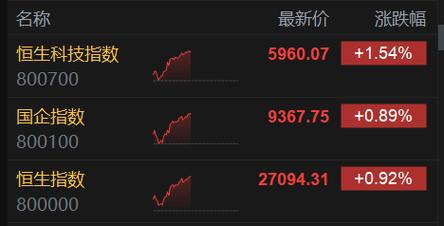 1月14日,港股指数小幅高开探底后集体震荡拉升,截止午盘,恒生指数涨0.92%报27094.31点,恒生科技指数涨1.54%报5960.07点,国企指数涨0.89%报9367.75点,红筹指数跌0.04%报4144.43点。