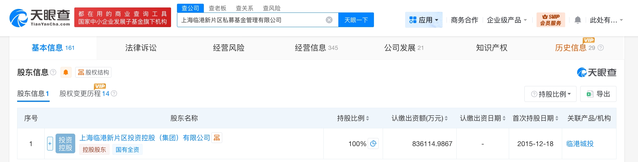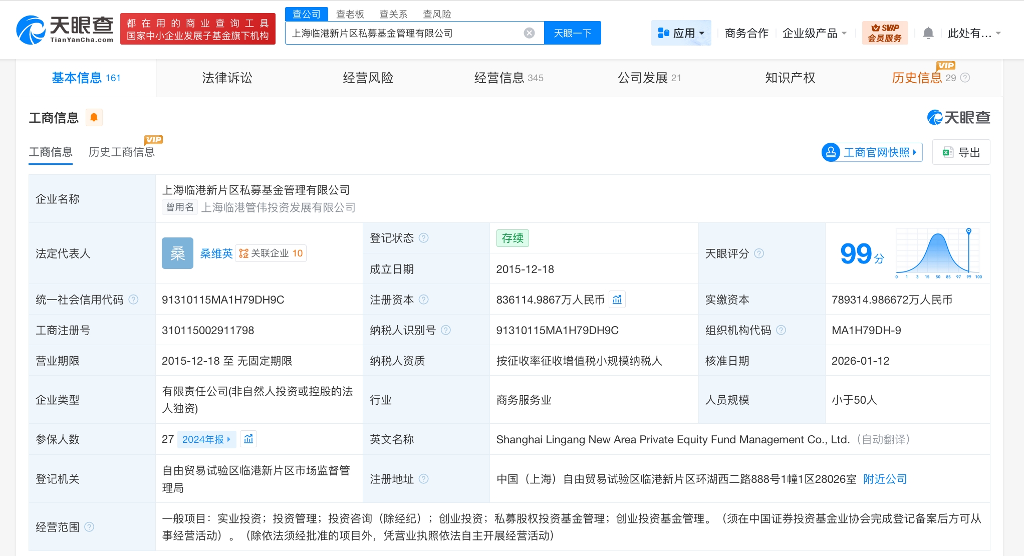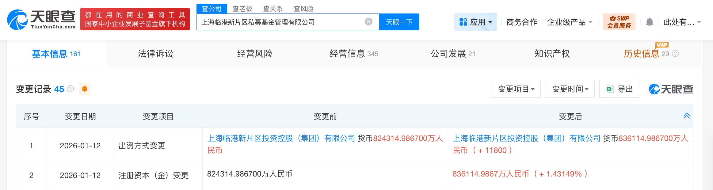 正文 上海临港新片区私募基金管理公司增资至83.6亿 三木 V管理员 /01-16 /0 评论 /8 阅读 0116 文章最后更新时间2026年01月16日,若文章内容或图片失效,请留言反馈! 天眼查工商信息显示,近日,上海临港新片区私募基金管理有限公司发生工商变更,注册资本由约82.4亿人民币增至约83.6亿人民币。 该公司成立于2015年12月,法定代表人为桑维英,经营范围为实业投资、投资管理、投资咨询、创业投资、私募股权投资基金管理、创业投资基金管理。股东信息显示,该公司由上海临港新片区投资控股(集团)有限公司全资持股。 关键词阅读: