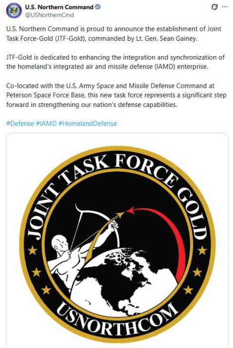 正文 美国北方司令部宣布成立“黄金联合特遣部队” 三木 V管理员 /01-16 /0 评论 /8 阅读 0116 文章最后更新时间2026年01月16日,若文章内容或图片失效,请留言反馈! 中新网1月16日电 据外媒16日报道,美国北方司令部在社交媒体上发布消息称,宣布成立“黄金联合特遣部队”(JTF-Gold),由肖恩·盖尼中将指挥。 美国北方司令部称,“黄金联合特遣部队”致力于“加强美国本土综合防空反导体系(IAMD)的整合与协同”。该特遣部队将与美国陆军太空和导弹防御司令部,共同驻扎在彼得森太空军基地。