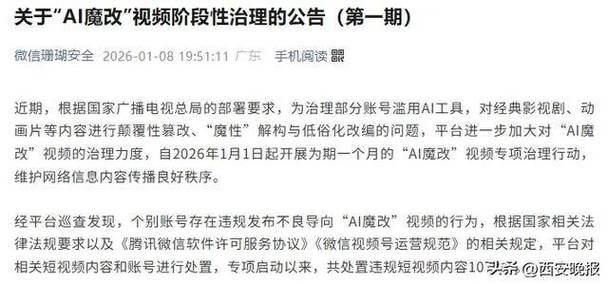 1月8日至1月15日平台累计清理处置“AI魔改”视频违规内容327条,处置违规账号15个。