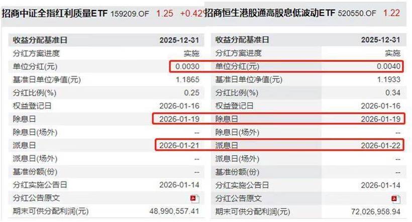 招商基金旗下两只特色红利策略ETF同步公告本月分红。其中,中证红利质量ETF(159209)迎来年度第七次分红,每份派现0.003元,港股红利低波ETF(520550)迎来年内第九次分红,每份派现0.004元。分红登记日为2026年1月16日,除息日为2026年1月19日,派息日分别为2026年1月21日、1月22日。