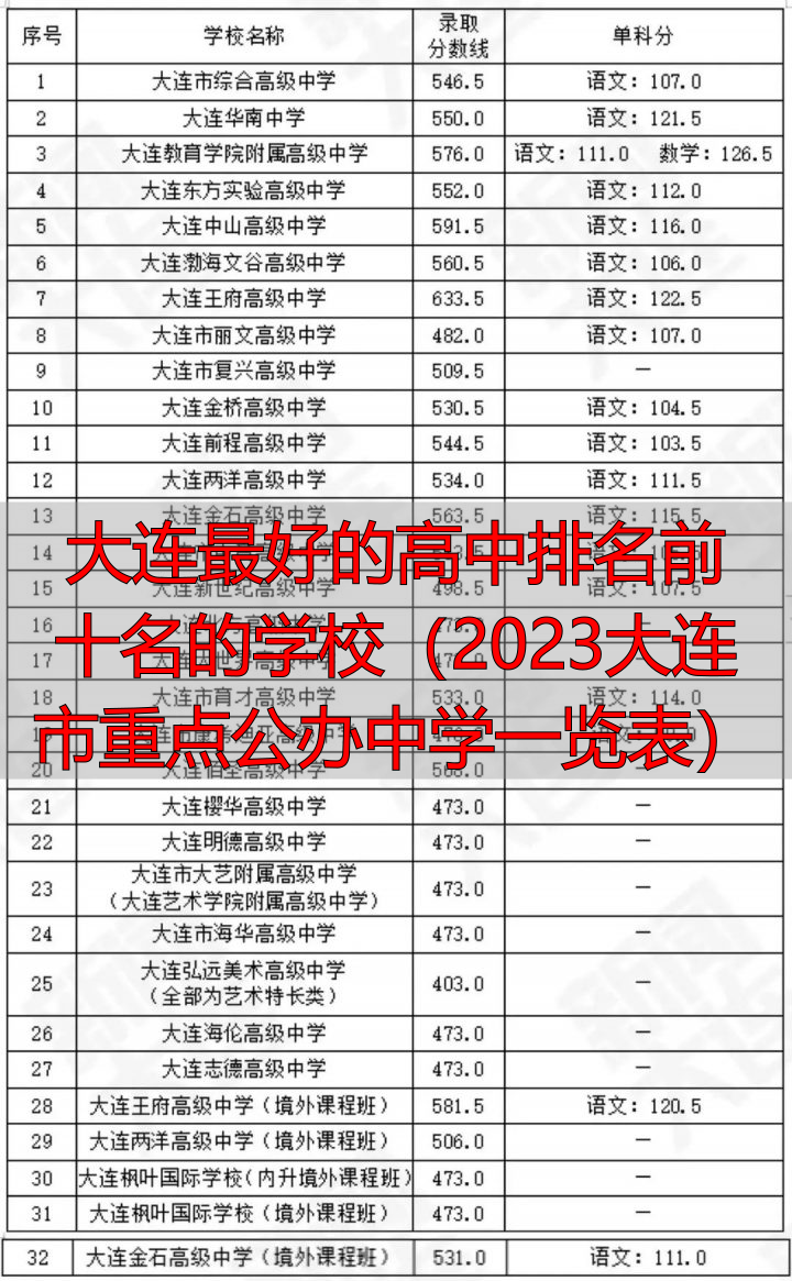 注明:以上关于大连市最厉害的公办重点高中排名前十的学校名单,来源网络,由于学校排名数据处于变动之中,因此重点高中排行榜仅供中学生及家长参考,不代表本站观点!希望以上内容对大家选校有所帮助。