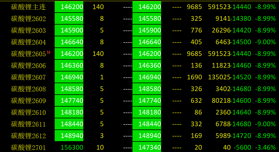1月16日,碳酸锂期货价格冲高回落,多个合约跌停。截至当日收盘,主力合约2605报146200元/吨,跌幅为8.99%,创下近期最大单日跌幅。