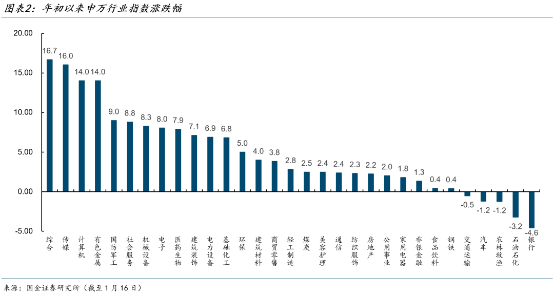 从板块表现看,传媒、计算机、有色、军工等行业领涨,年初以来涨幅达到16.0%、14.0%、14.0%、9.0%,映射出当前市场的主线围绕“AI和地缘”展开。其中,AI驱动行情正从上游的算力基建向下游的AI应用延伸,委内瑞拉、伊朗等地缘冲突对有色和军工板块形成催化。
