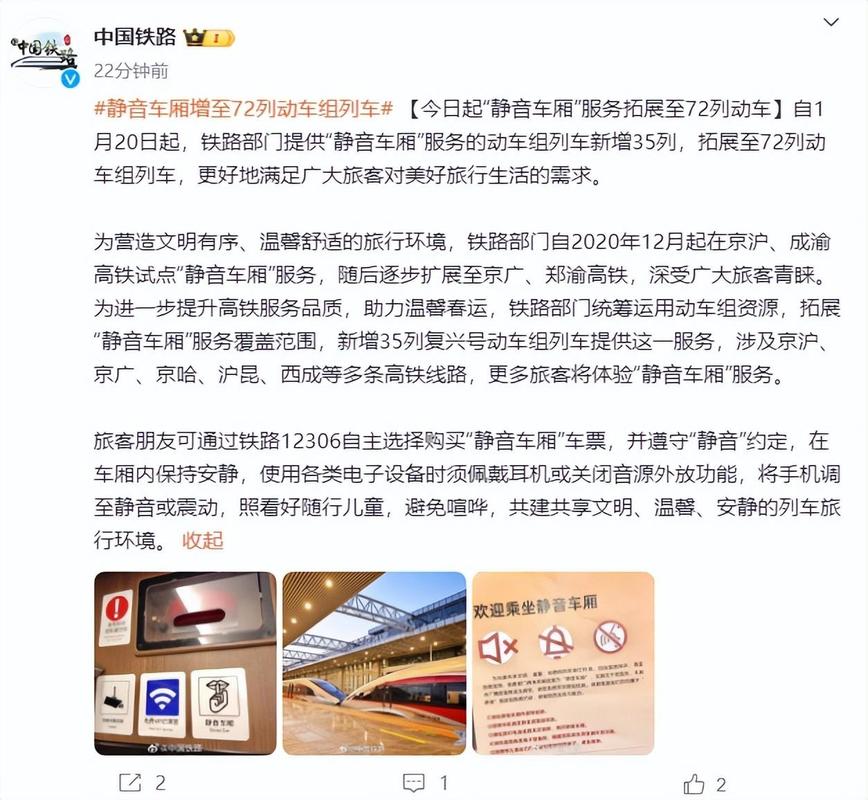 铁路部门自2020年12月起在京沪、成渝高铁试点“静音车厢”服务,逐步扩展至京广、郑渝、京哈、沪昆、西成、贵南高铁以及内地与香港间开行的跨境高铁列车,深受广大旅客青睐。为进一步提升高铁运营服务品质,满足旅客差异化出行需求,铁路部门在前期试点效果良好的基础上,将“静音车厢”服务范围拓展至除动卧列车之外的“D”字头、“G”字头动力分散动车组列车,其中8辆、16辆编组的单组动车组列车设1节“静音车厢”;17辆编组的长编复兴号动车组列车设2节“静音车厢”;重联动车组列车前组、后组分别设1节“静音车厢”,更多旅客将体验“静音车厢”服务。