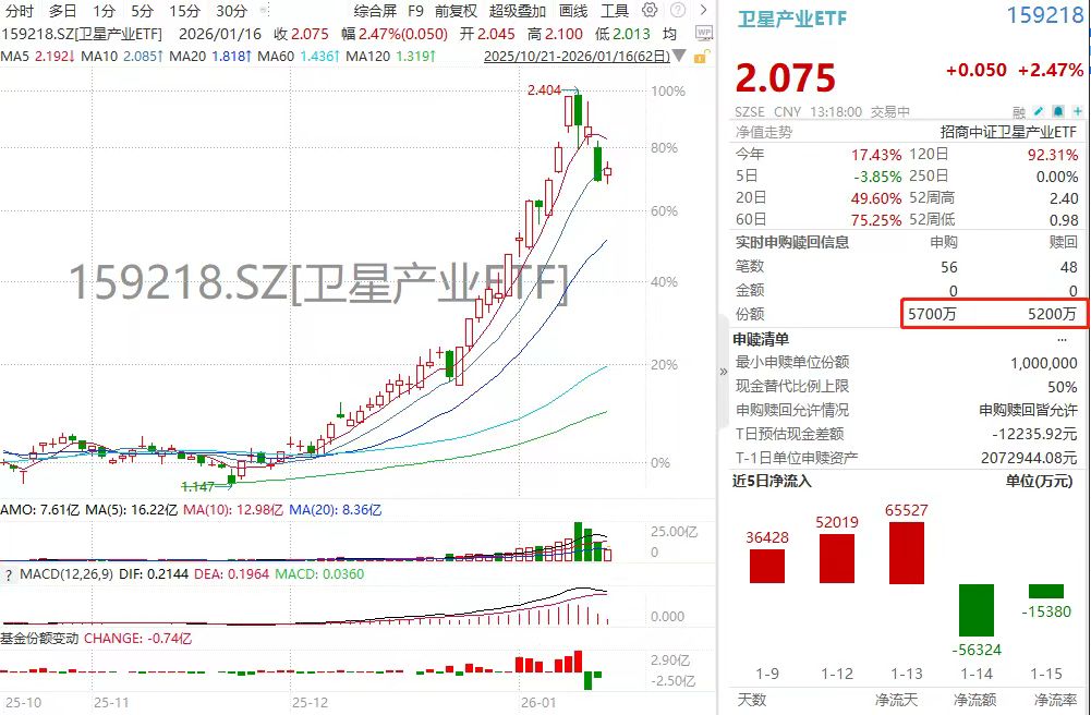 1月16日,卫星板块回暖。数据显示,截至13时18分,表征板块的卫星产业ETF(159218)涨2.37%,中国卫通、中科星图联袂上涨值得留意的是,盘中午后转为净流入。