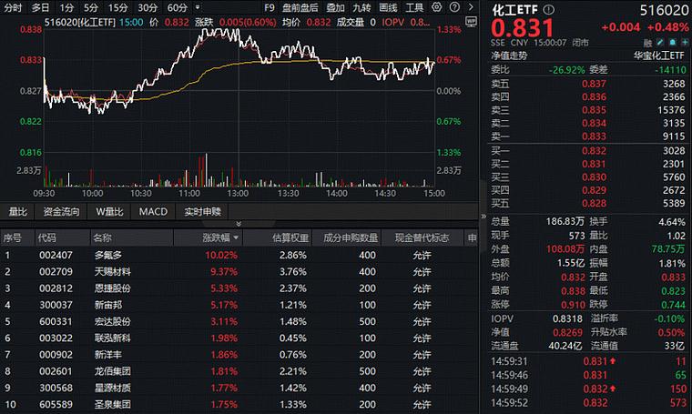 成份股方面,钾肥、氮肥、石化等板块部分个股涨幅居前。截至发稿,昊华科技、亚钾国际、恒力石化等大涨超4%,三美股份、东方盛虹、巨化股份等多股涨超3%。