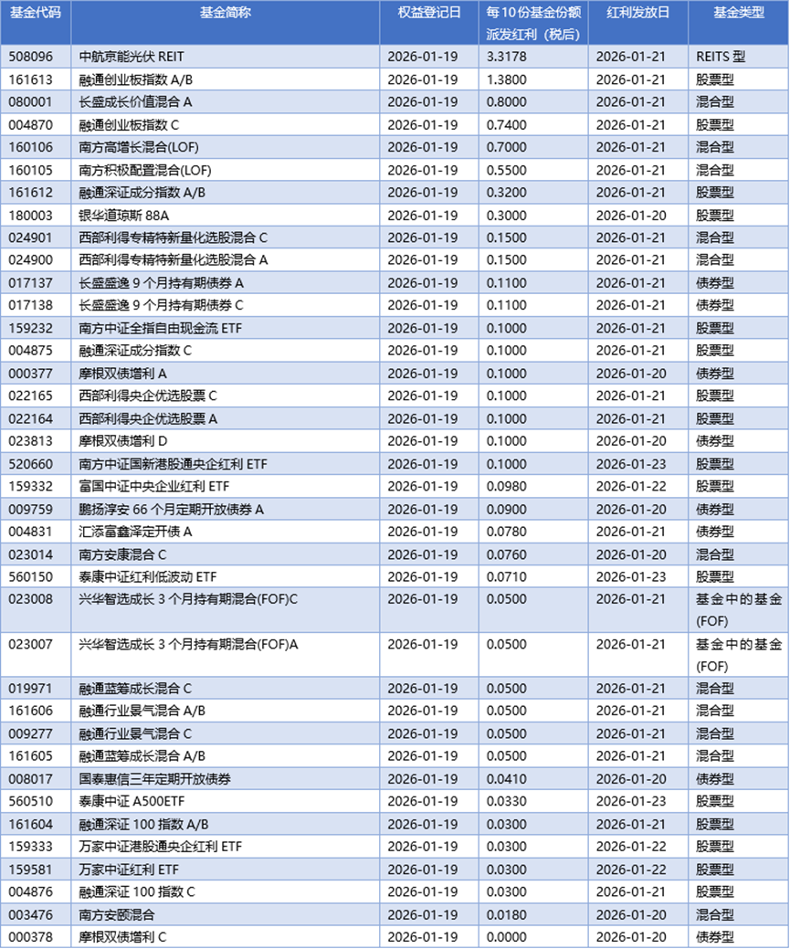 (1)01月19日新发基金共有57只,主要为基金中的基金(FOF)基金和混合型基金,其中天弘中证工业有色金属主题ETF募集目标金额达80.00亿元;基金分红38只,多为股票型,派发红利最多的基金是中航京能光伏封闭式基础设施证券投资基金,每10份基金份额派发红利3.3178元。