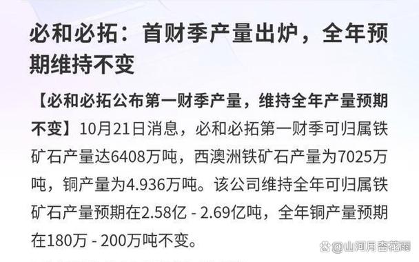 智通财经获悉,截至12月底的三个月内,全球最大的矿业公司必和必拓(BHP.US)第二财季生产铁矿石6970万吨,比去年同期增长5%,并重申了其年度产量预期。该矿商将本财年铁矿石产量的预测维持在 2.84 亿至 2.96 亿吨不变,并指出上半财年强劲的产量使其在通常多雨的第三财季开局良好。铁矿石实际价格小幅上涨至每吨84.71美元。